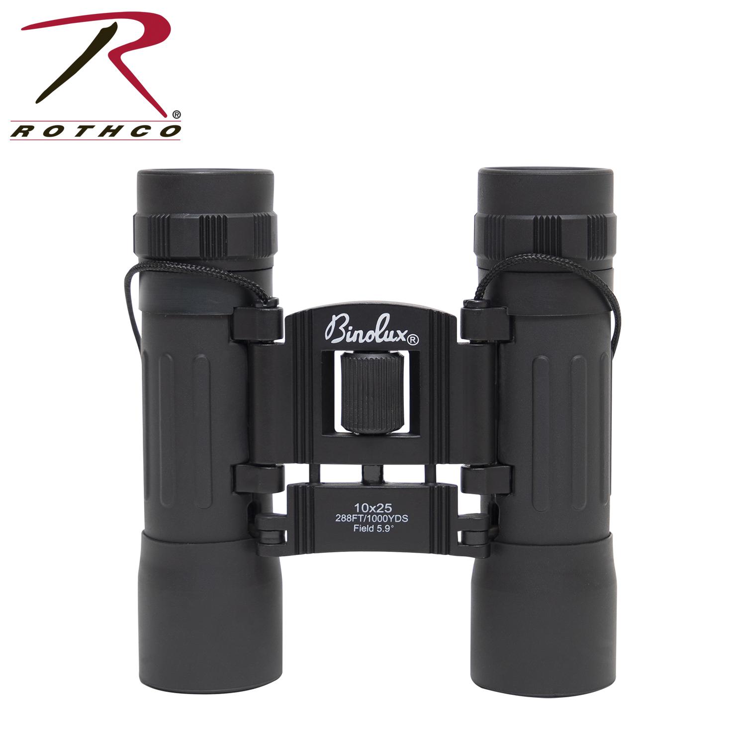 See clearly over long distances with Rothco’s reliable Compact 10 x 25 mm Binoculars. These small binoculars provide a comprehensive 288-foot field of vision at 1,000 yards. The hunting binoculars offer 10X magnification with a compact folding roof prism design that makes them lightweight, comfortable to hold, and ideal for taking on-the-go. Rubber eyecups on the birding binoculars protect the eyepiece and offer added comfort. With a convenient lanyard and black carrying case included, these binoculars are perfect for hikers, hunters, birders, stargazers, and more.