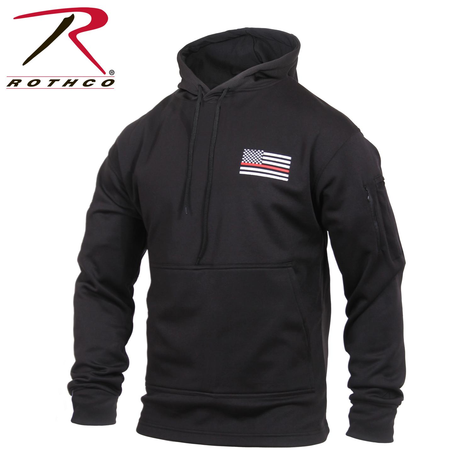 Our Concealed Carry Thin Red Line Hoodie features a distressed American Flag graphic on the left chest and across the back, showing respect and support for police and law enforcement officials. This hoodie sweatshirt also offers best-in-class discrete carry while providing unbeatable warmth and comfort. Whether you're out on a weekend trip or just running errands around town, this hoodie has everything you need to stay comfortable and prepared. Discrete & Fast:The passthrough kangaroo pocket allows for quick and easy access to your IWB for appendix carry. In addition, the 8.25 inch internal vertical access point ensures that most standard EDC (Everyday Carry) essentials will fit comfortably. Staying Cool and Dry:Made of 100% polyester, these CCW hoodies wick sweat and moisture away for optimum comfort. Featuring our rapid moisture control fabric, sweat is swiftly transferred to the top layer, allowing for a quick dry. This prevents sweat from soaking through the moisture-wicking hoodie and back into your undershirt, allowing you to move freely without your clothing sticking to you. These comfortable hoodies are perfect for both normal everyday wear and for those who work in public safety. Secure Storage:The pullover hoodie also features two zippered sleeve pockets with wire passthrough ports, allowing you to safely tuck away your phone, wallet, or other everyday carry items. The right sleeve includes a dual pen pocket for keeping writing utensils, while the left sleeve features a loop panel for adding morale and flag patches. Warm & Comfortable:With a soft fleece lining, these pullover hooded sweatshirts offer all-day (and all-night) comfort. The drawstring hood keeps your head and neck warm while protecting you against cold wind and rain. The built-in thumbholes preserve your hands’ heat without sacrificing your mobility and range of motion. A Helping Hand:Proceeds from the sale of our Thin Red Line items benefit the families of fallen first responders through our
