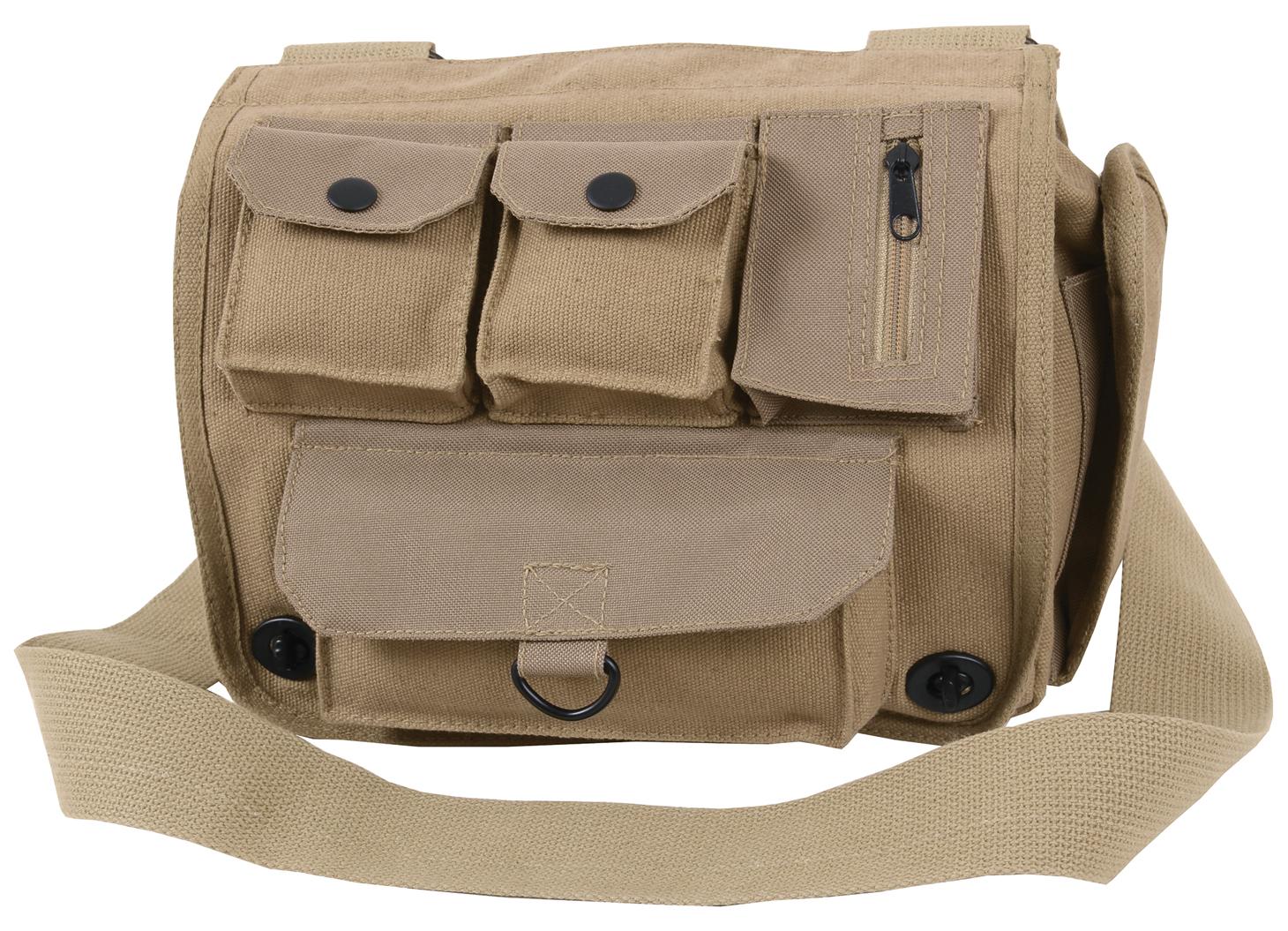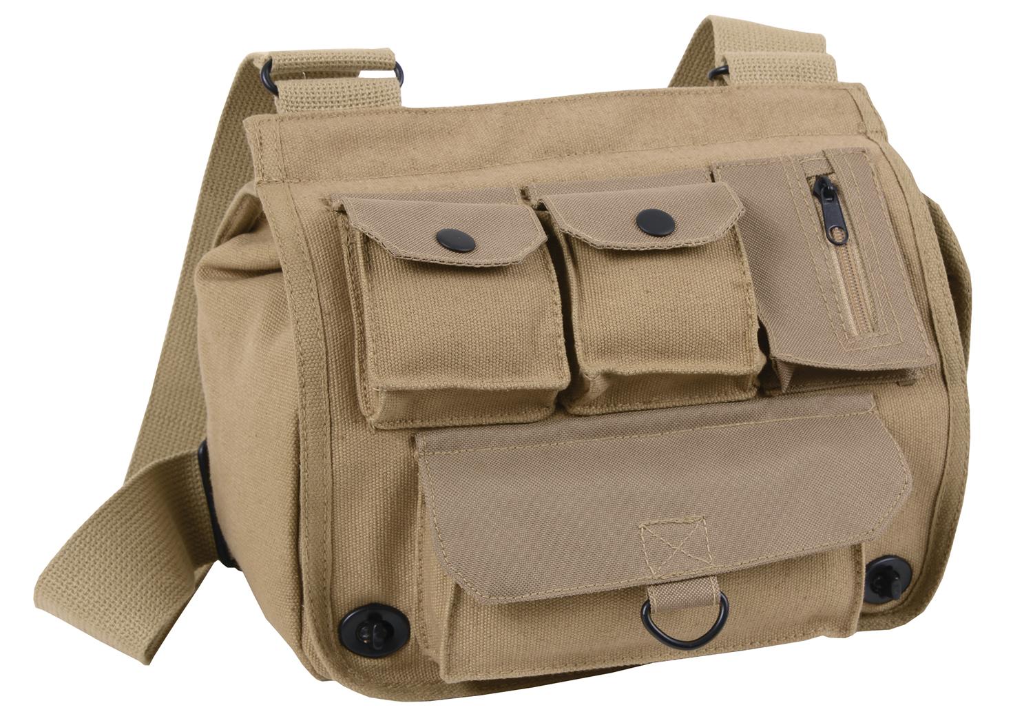 Rothco’s Venturer Survivor Shoulder Bag provides plenty of storage compartments in a compact easy-to-carry package that is perfect for EDC (everyday carry) and the great outdoors. The shoulder bag features a roomy main compartment measuring 10 inches x 8 inches x 5 inches and a water repellent nylon interior. The main compartment features an open top back flap that is perfect for storing a tablet. Three compact top pouches on the front flap of the canvas bag; two with snap closures and one with a zipper for additional storage options (pouches measure 3 inches x 3 ½ inches x 1 inch). A long horizontal front pouch is double secured with two snaps and a hook and loop closure and features a D-ring for accents and attachments (measures 6 ½ inches X 3 ½ inches X 1 inch). The super secure main compartment is closed with two turn locks and an inner snap closure. A large inside open top pocket measures 10 inches X 5 ½ inches). The bag features two compact open top inside pockets, the right pocket features five pen compartments (pockets measure 5 inches X 4 inches each). An open top back pocket provides quick access to essential items, while the adjustable shoulder strap extends up to 54 inches. A utility pocket on the side of the bag is fastened via a snap closure (measures 3 ½ inches X 5 inches X 2 inches). The bag measures 10 inches X 11 inches X 5 inches and features a heavy-duty material composition for years of reliable use.