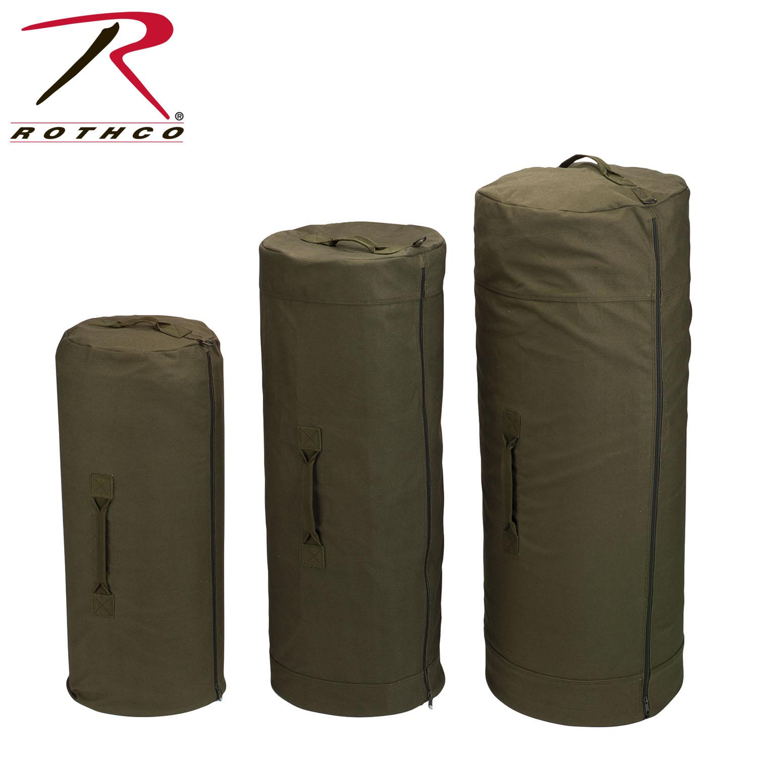 When planning for an exciting adventure, you shouldn’t have to worry about fitting everything into one pack. Our Canvas Duffle Bag with Side Zipper offers an all-in-one place to carry your equipment and gear. From storing camping essentials, to lugging around sporting goods, this heavy-duty military bag will handle it all! It also makes for a great bugout bag and offers unbeatable off-road recovery storage! Top Grade Canvas:Made from Rothco’s durable heavyweight canvas fabric, this superior material is naturally water-resistant, rugged, and is built for the long haul. These sports duffle bags are made of 100% cotton canvas weighing 22 oz (Woodland Camo is 18 oz), ensuring that your gear stays protected. No one comes close to Rothco’s collection of ultra-premium canvas bags and packs. Safe & Secure:These travel duffle bags feature a horizontal two-way side zipper for convenient access to your equipment, allowing you to easily pack larger items by sliding the bag over from the side. The heavy-duty zippers are designed to withstand rugged outdoor use, and will last through the test of time. Various Carry Options:The top and 2 side grab handles are double reinforced with box X stitching and extra canvas fabric underneath and on the top. This added support allows you to comfortably carry heavier loads without the risk of the handles breaking. The 2 d-rings at the ends also feature the reinforced stitching, and give you the option to add a shoulder strap (not included) or additional accessories and gear. Multipile Sizes Available:These canvas duffle bags come in 3 sizes: Standard (84 Liters) = 21 inch x 36 inch / Jumbo (142 Liters) = 25 inch x 42 inch / Giant (266 Liters) = 30 inch x 50 inch