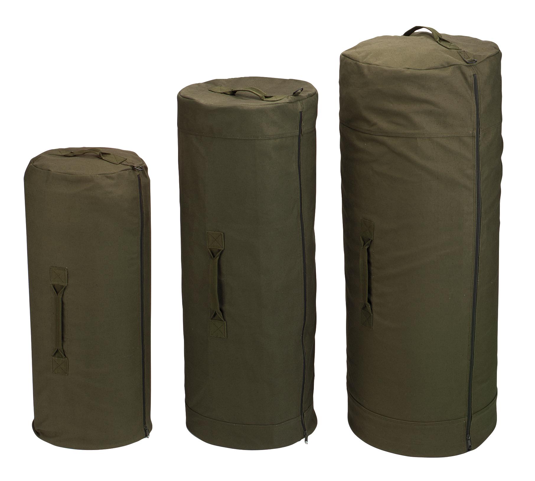 When planning for an exciting adventure, you shouldn’t have to worry about fitting everything into one pack. Our Canvas Duffle Bag with Side Zipper offers an all-in-one place to carry your equipment and gear. From storing camping essentials, to lugging around sporting goods, this heavy-duty military bag will handle it all! It also makes for a great bugout bag and offers unbeatable off-road recovery storage! Top Grade Canvas:Made from Rothco’s durable heavyweight canvas fabric, this superior material is naturally water-resistant, rugged, and is built for the long haul. These sports duffle bags are made of 100% cotton canvas weighing 22 oz (Woodland Camo is 18 oz), ensuring that your gear stays protected. No one comes close to Rothco’s collection of ultra-premium canvas bags and packs. Safe & Secure:These travel duffle bags feature a horizontal two-way side zipper for convenient access to your equipment, allowing you to easily pack larger items by sliding the bag over from the side. The heavy-duty zippers are designed to withstand rugged outdoor use, and will last through the test of time. Various Carry Options:The top and 2 side grab handles are double reinforced with box X stitching and extra canvas fabric underneath and on the top. This added support allows you to comfortably carry heavier loads without the risk of the handles breaking. The 2 d-rings at the ends also feature the reinforced stitching, and give you the option to add a shoulder strap (not included) or additional accessories and gear. Multipile Sizes Available:These canvas duffle bags come in 3 sizes: Standard (84 Liters) = 21 inch x 36 inch / Jumbo (142 Liters) = 25 inch x 42 inch / Giant (266 Liters) = 30 inch x 50 inch