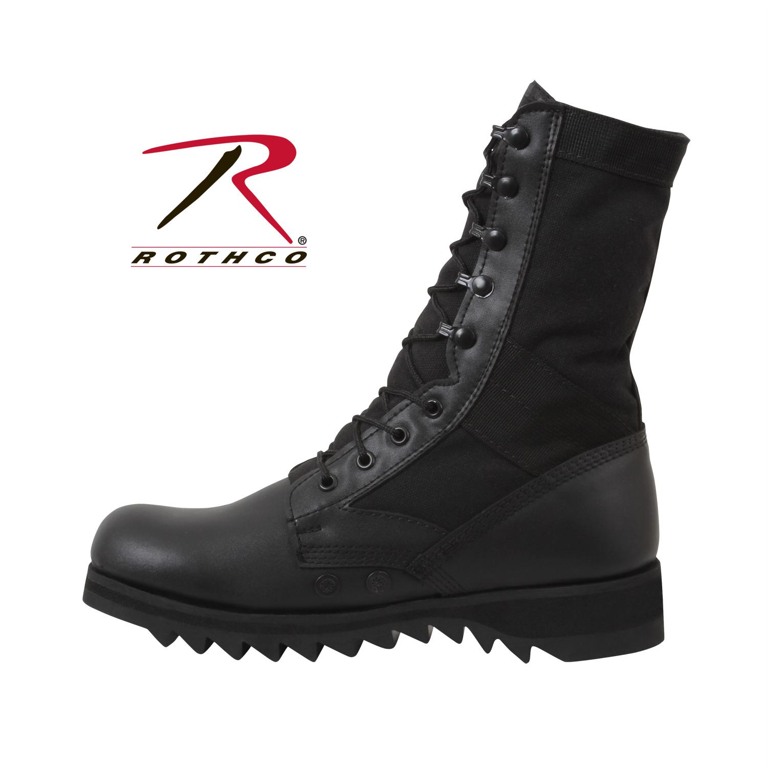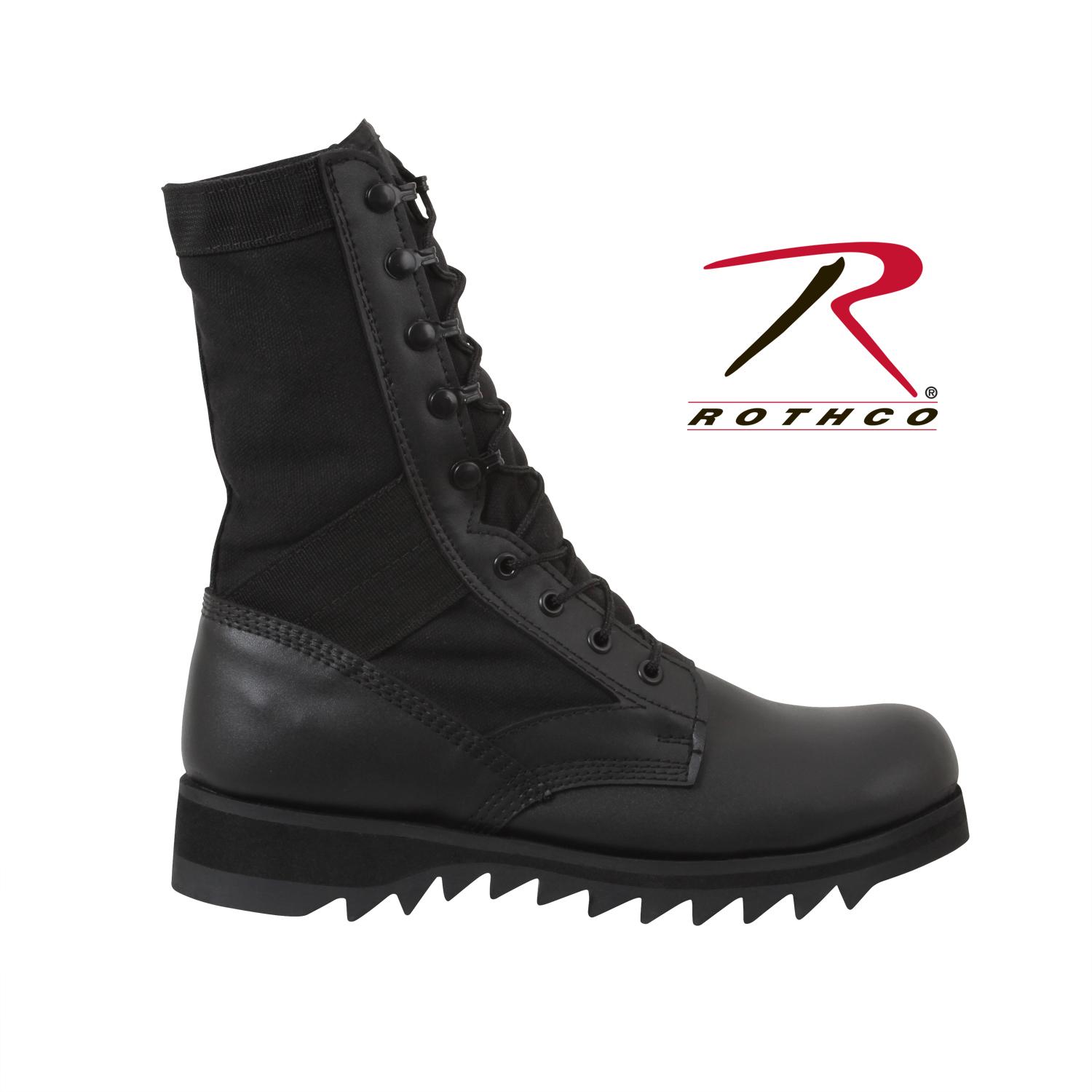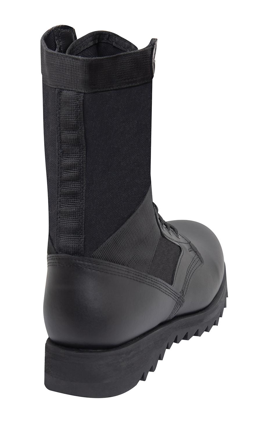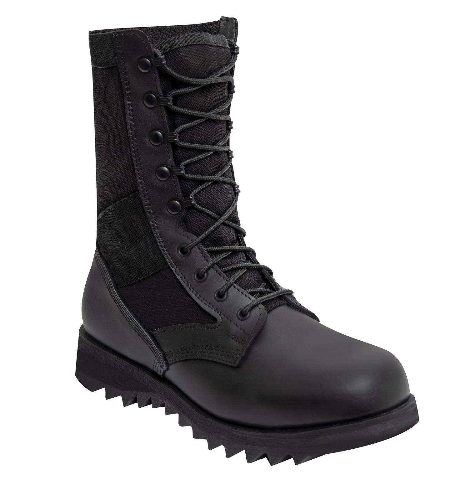 Rothco's Ripple Sole Jungle Boots is a classic military boot with a modern feel. These ripple sole boots come with a removable cushion insole and a steel shank for maximum comfort and support. A nylon coated brass speed hook/eyelet lacing system provides easy lacing for quick on and off. The leather upper, midsole heat barrier, and padded collar make this military boot durable for everyday wear out in the field.
