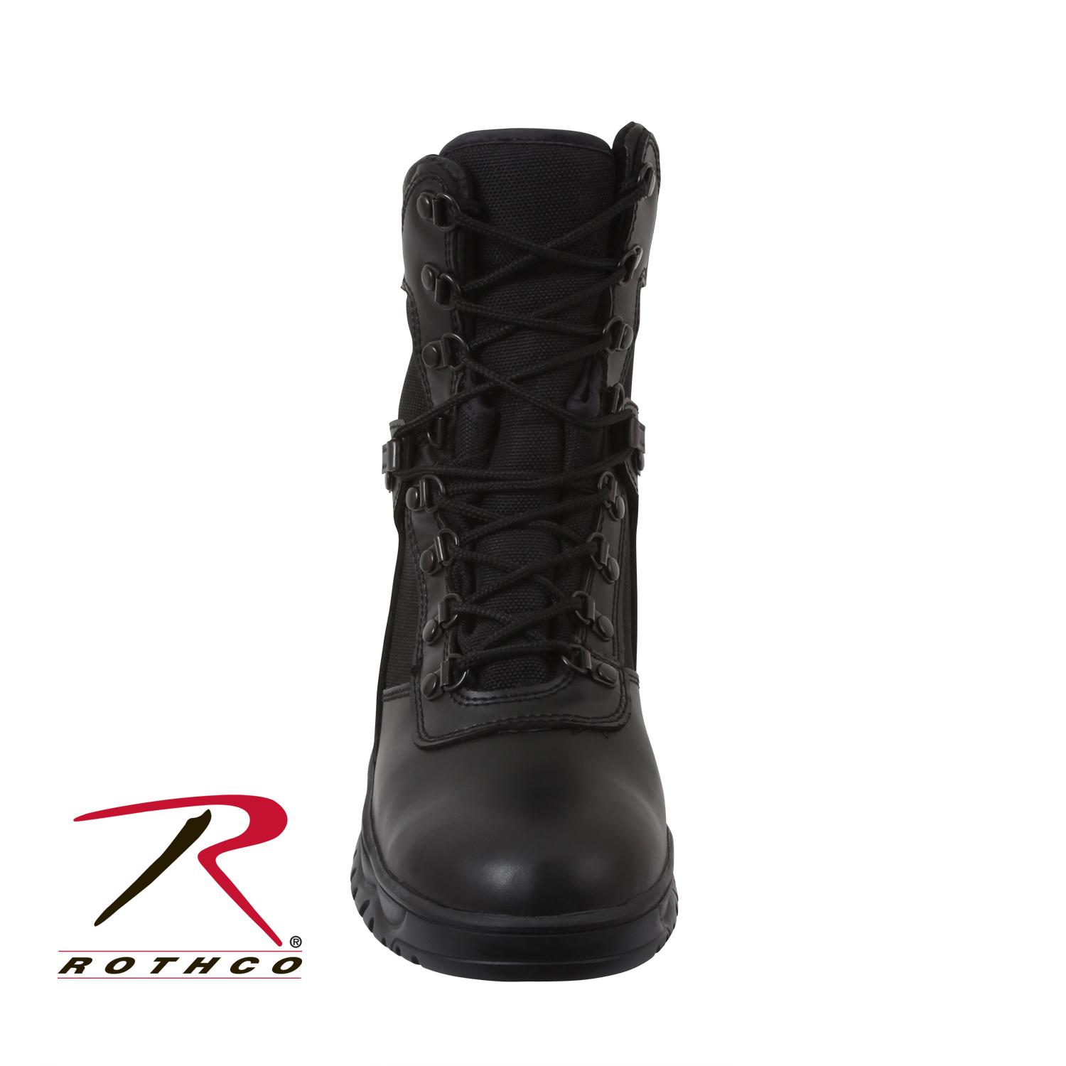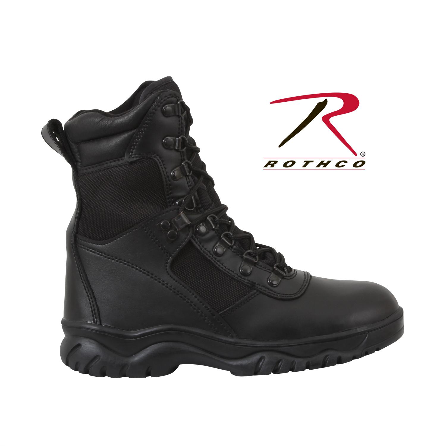 Experience superior performance with Rothco's 8-Inch Forced Entry Waterproof Tactical Boot. Designed for everyday use and tactical needs, this rugged boot combines cutting-edge features. The moisture-wicking and waterproof technology, along with a gusseted tongue, ensures all-day comfort and protection. With a waterproof leather outer material, rust-proof hardware, and a slip-resistant cup sole, this boot delivers durability and stability in any environment. The speed laces with rustproof hardware make for quick adjustments, while the steel shank provides added support. Elevate your tactical gear with this reliable and versatile waterproof boot. Designed with precision and built to withstand the harshest conditions, Rothco's collection of footwear and accessories combines durability, functionality, and unparalleled performance. From our Forced Entry Series which features our speedlace and waterproof technologies, to our V-Max Collection designed with lightweight running shoe soles, our diverse range of footwear provides unmatched comfort and protection for everyone from active-duty personnel to outdoor enthusiasts. With a rich heritage spanning over 7 decades, Rothco is the go-to brand for all things that keep you standing on your feet.