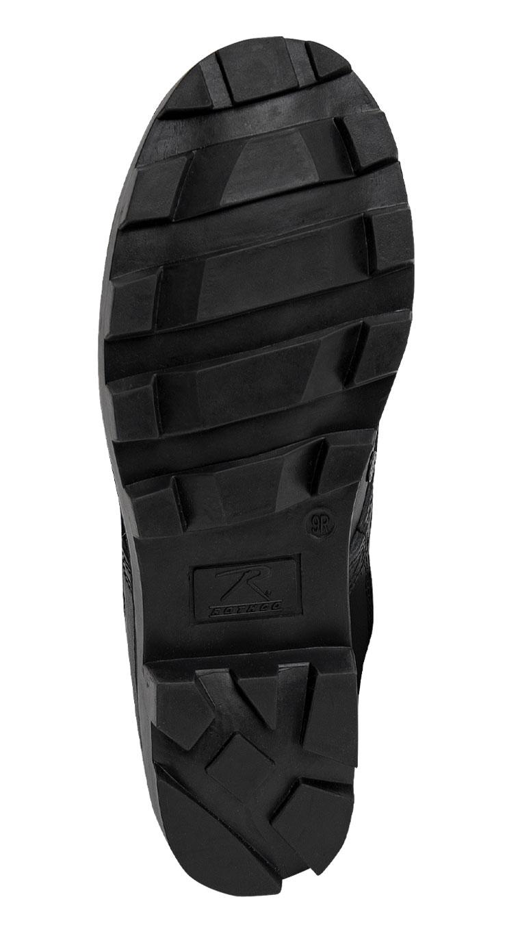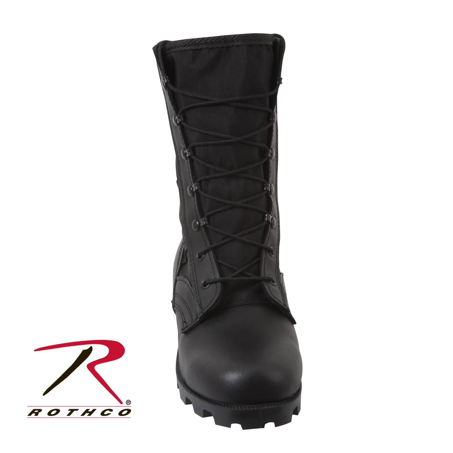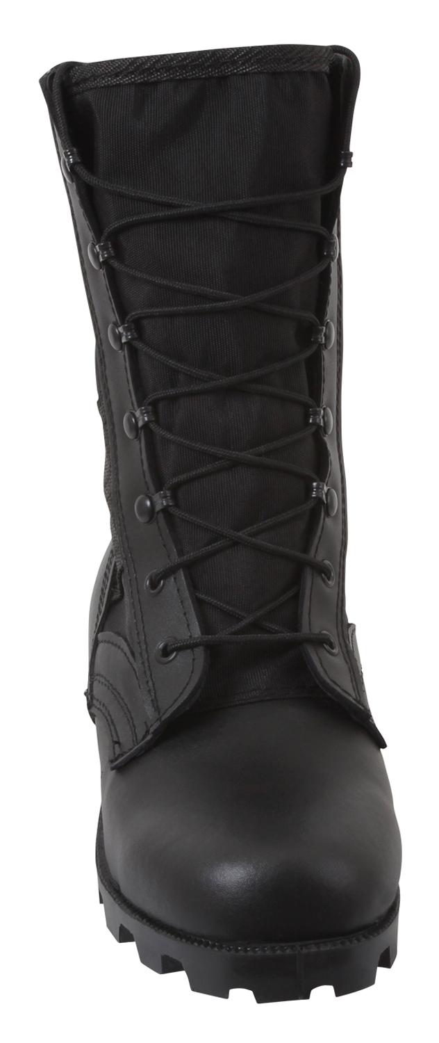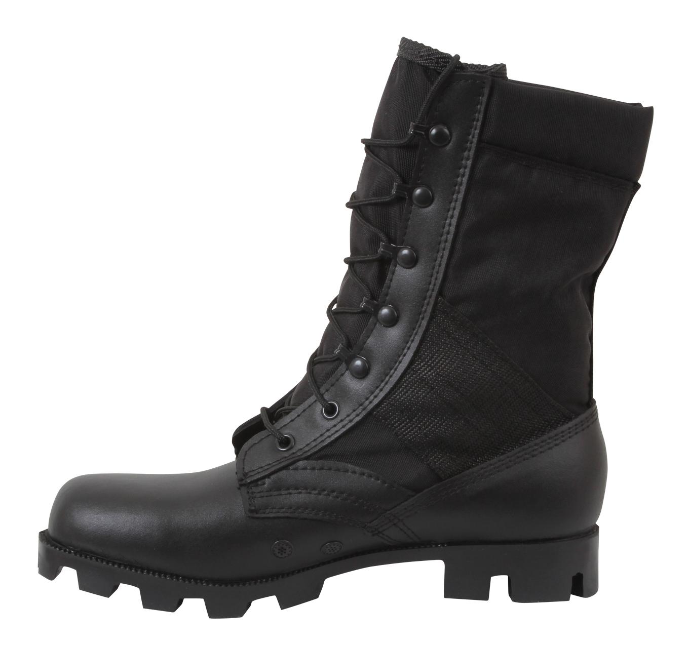 Rothco’s Black Speedlace Jungle Boots are the epitome of action footwear, engineered to conquer wet and humid jungle terrain. The advanced lacing system, featuring speed hooks and eyelets, ensures swift and easy tightening in the field. The vulcanized rubber Panama outsole delivers superior traction, preventing slips on challenging surfaces. With a removable cushion insole, steel shank, and leather midsole, these service jungle boots provide endurance during long hours in tough terrain. Crafted with a nylon/leather upper and action leather vamp, these 9-inch boots offer unparalleled support in hot and wet environments. Prepare for any mission with Rothco's jungle boots. Designed with precision and built to withstand the harshest conditions, Rothco's collection of footwear and accessories combines durability, functionality, and unparalleled performance. From our Forced Entry Series which features our speedlace and waterproof technologies, to our V-Max Collection designed with lightweight running shoe soles, our diverse range of footwear provides unmatched comfort and protection for everyone from active-duty personnel to outdoor enthusiasts. With a rich heritage spanning over 7 decades, Rothco is the go-to brand for all things that keep you standing on your feet.
