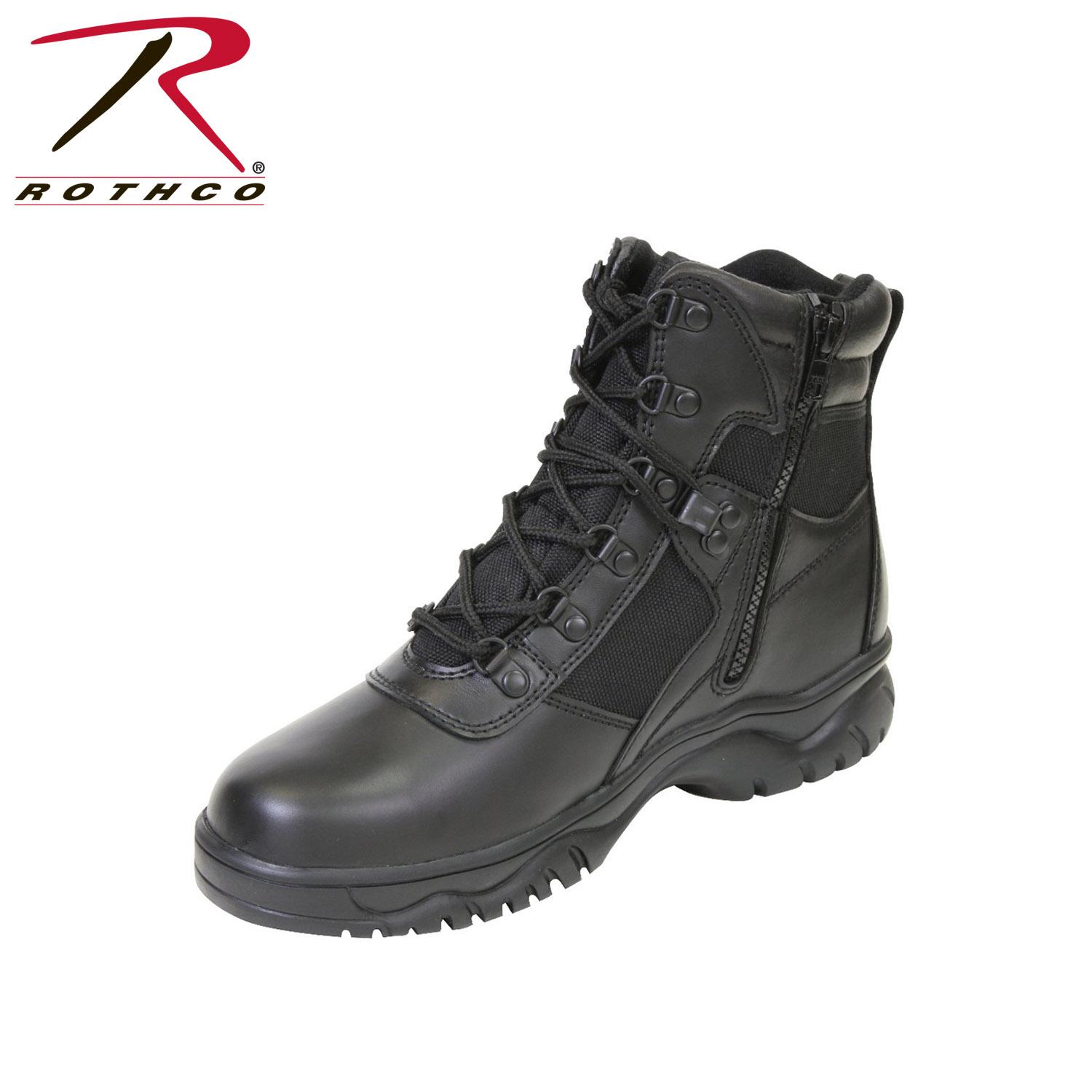 Rothco 6 Inch Waterproof & Blood Pathogen Resistant Tactical Boot features Leather & Nylon upper with waterproof and blood born pathogen membrane which protects the wearer from blood-borne pathogens and moisture. Rothco's tactical boot also features a moisture wicking lining to ensure optimal comfort and dryness. The side zipper with hook & loop zipper keeper tab was strategically designed so that the boots can be put on and off quicker than the traditional lace-up military boots. Additional features of the boot include removable insoles and gusseted tongue for additional comfort, steel shank and D-ring eyelets. The slip-resistant cup sole provides maximum grip.