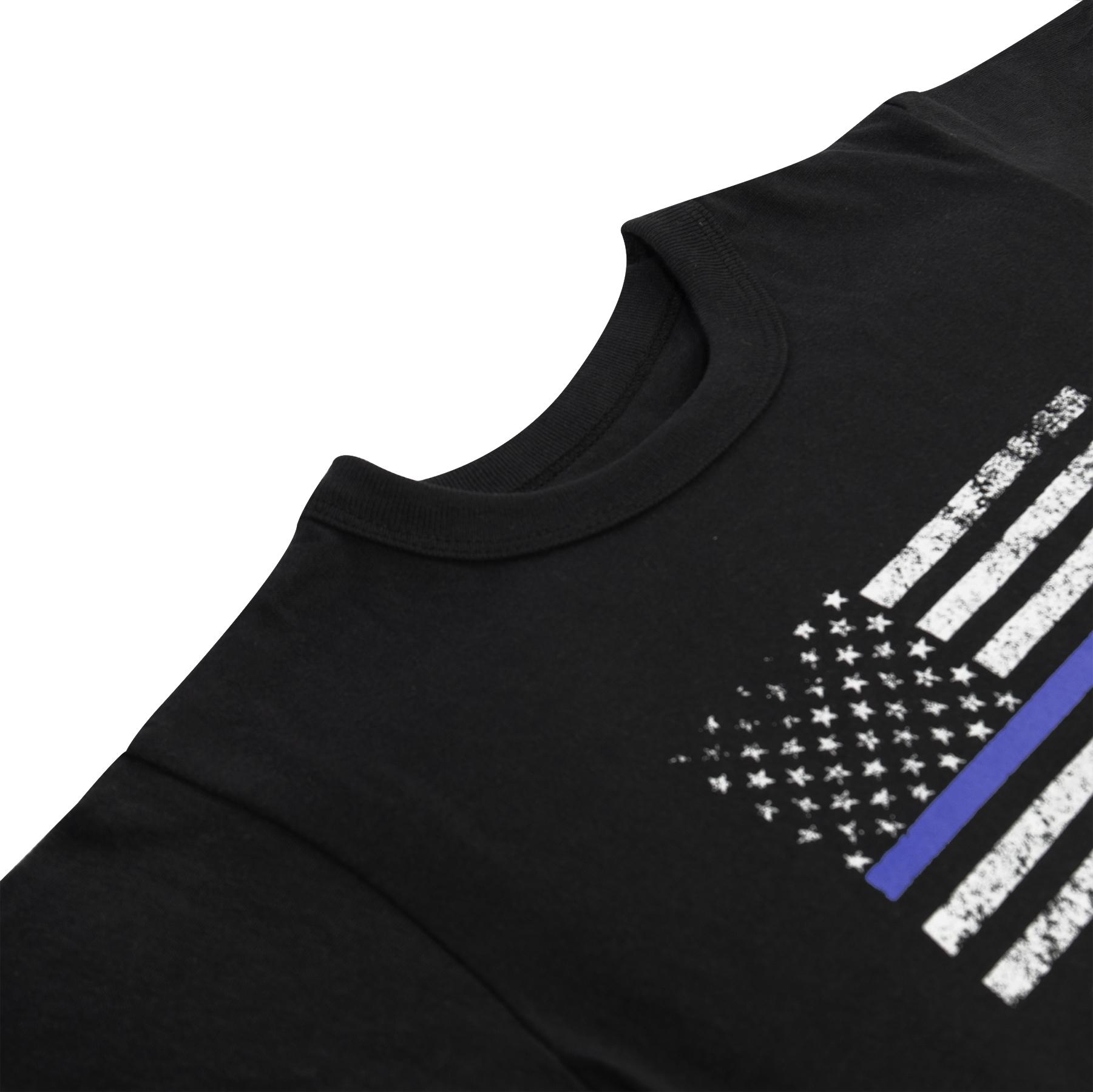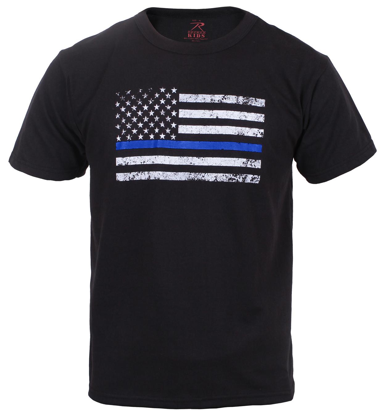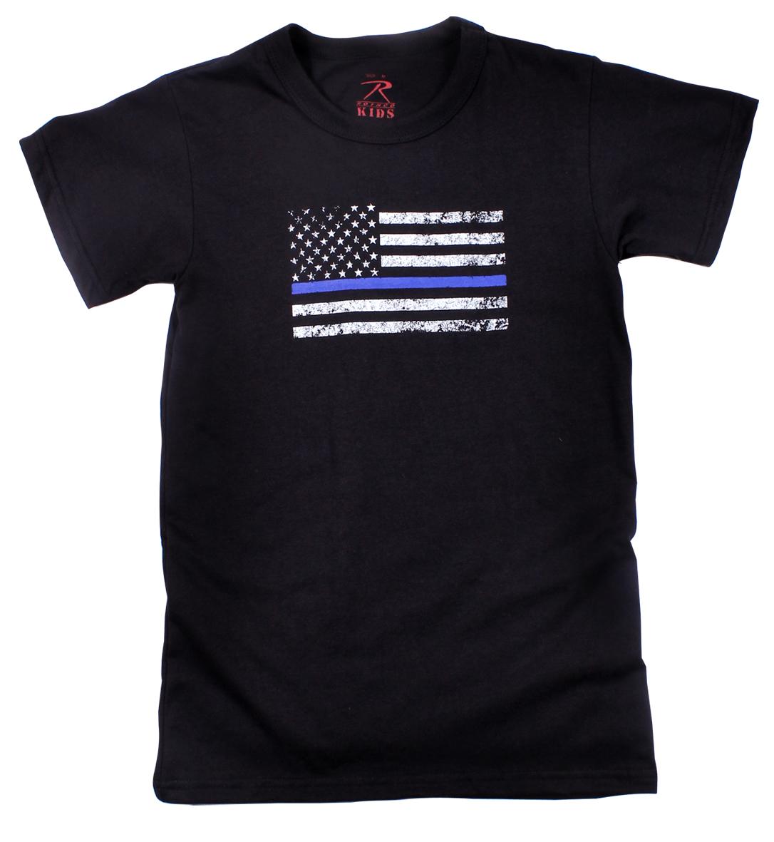 Show your support with Rothco’s Kids Thin Blue Line T-Shirt. This kid's shirt is made of a soft 60% cotton / 40% polyester blend material and tagless label for added comfort. A US Flag with a thin blue line is printed on the center chest.