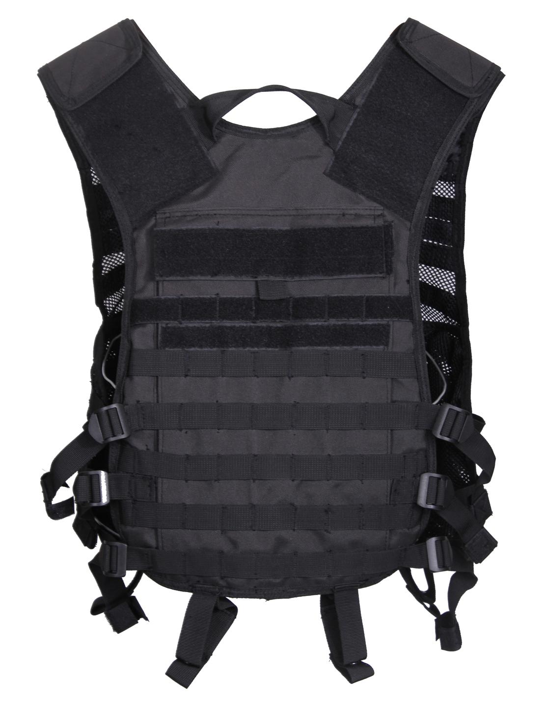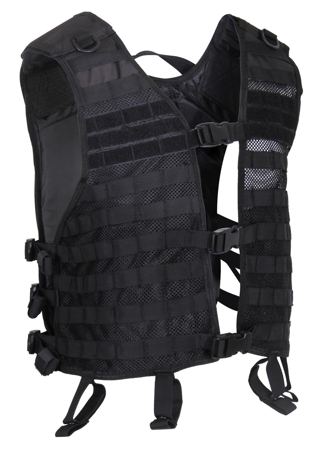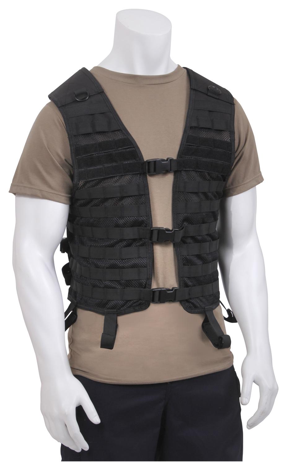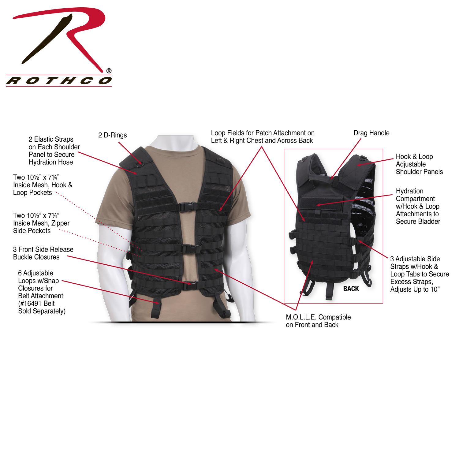 The front and back of the utility vest features multiple rows of MOLLE loops for fastening Modular Lightweight Load-carrying Equipment compatible gear and pouches. Numerous strips of loop field on both the front chest and back of this tactical vest allow for patch attachment and hook and loop accessories. Our MOLLE vest is crafted for comfort, with hook and loop adjustable shoulder panels, 3 side straps adjustable up to 10 inches, and 3 front side release buckle closures so that you can adjust to your perfect, secure fit. Side straps on this lightweight vest feature hook and loop tabs to tame excess straps. This M.O.L.L.E. vest is hydration compatible, offering 2 elastic straps on each shoulder panel to secure hydration hose, along with a hydration compartment with hook and loop attachments on back to secure a bladder. The interior features 4 mesh side pockets, 2 zippered, and 2 with hook and loop closure for storing essentials. This tactical mesh vest also includes dual D rings atop of shoulder panel and a drag handle for emergency use and 6 loops with snap closures for belt attachment (16491 belt sold separately). This vest is constructed with a breathable mesh front and durable polyester back, the optimal combination for withstanding rugged missions.