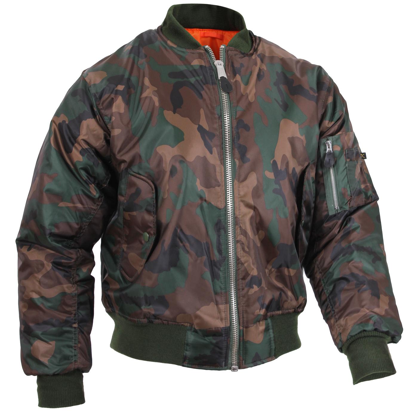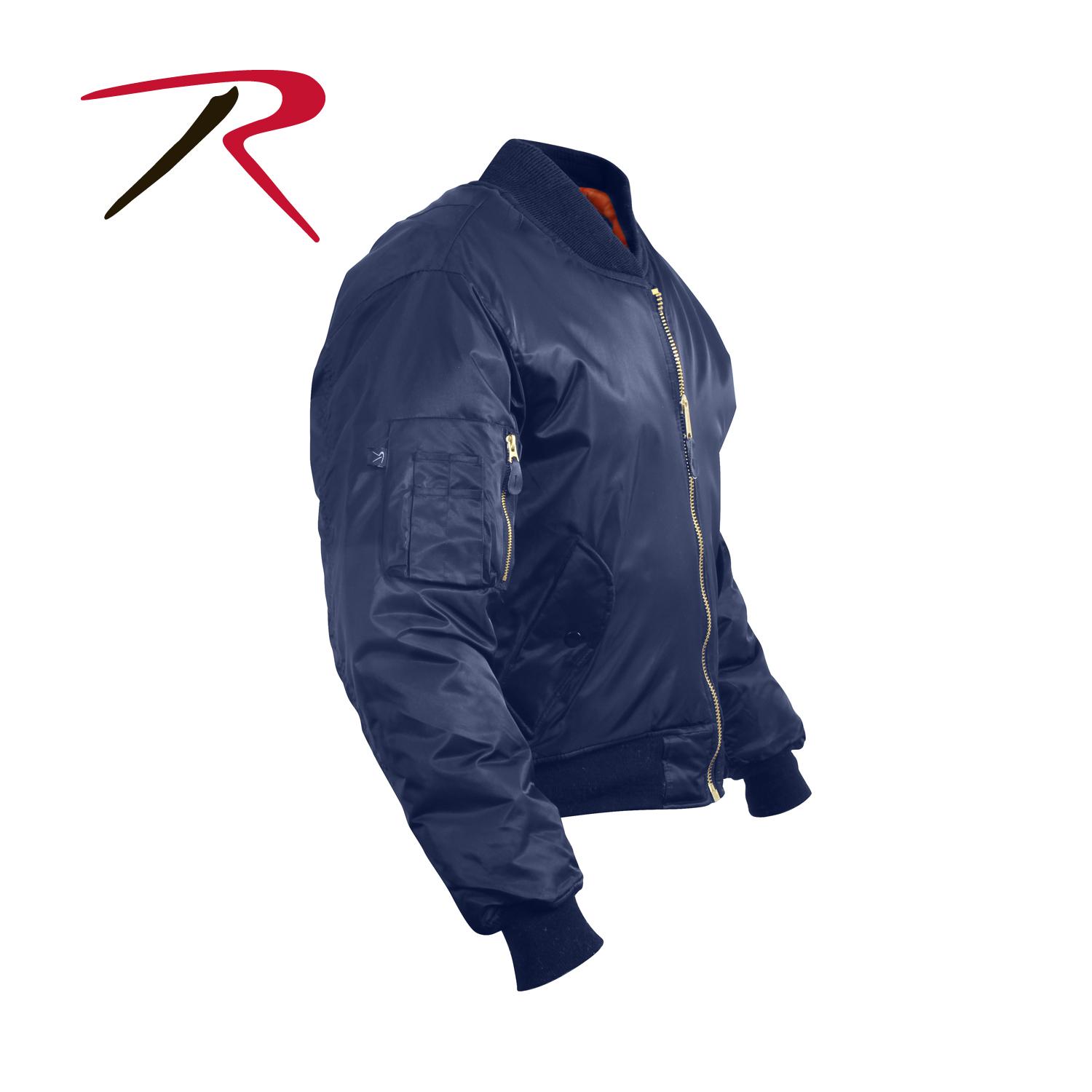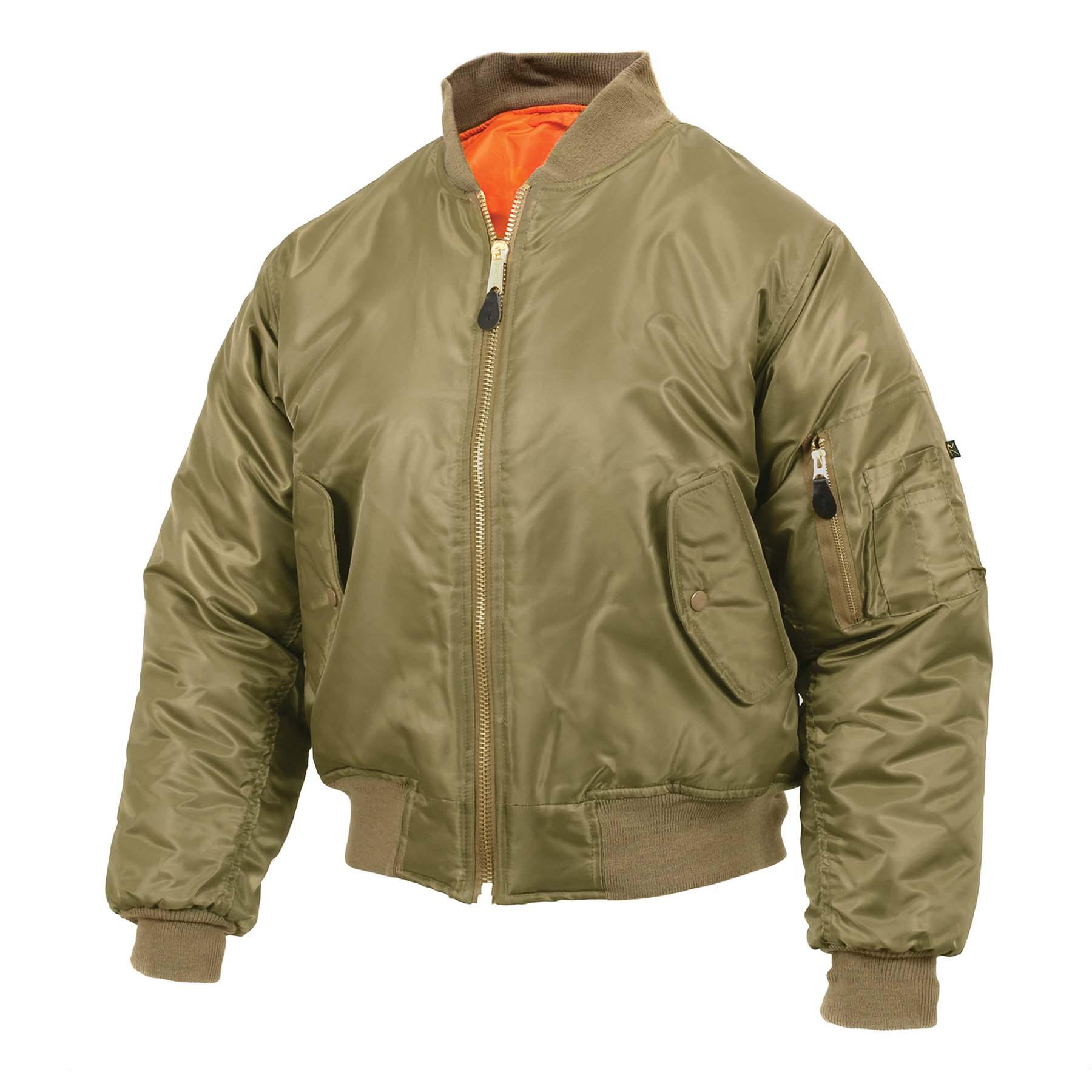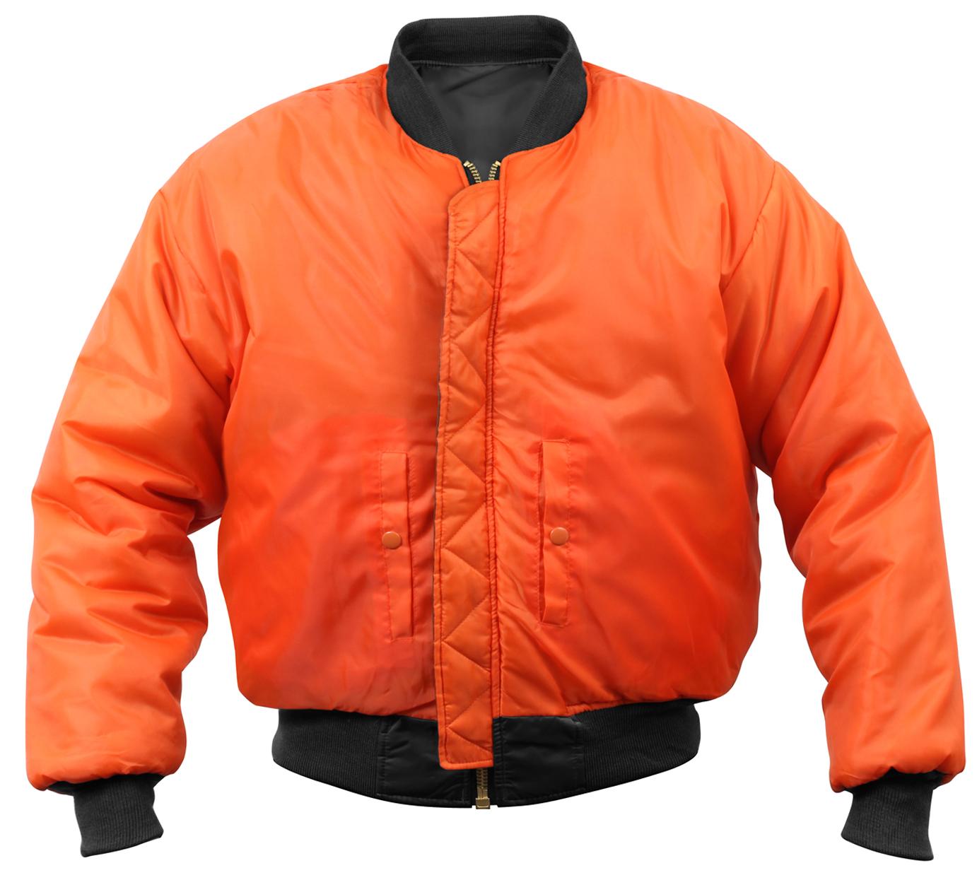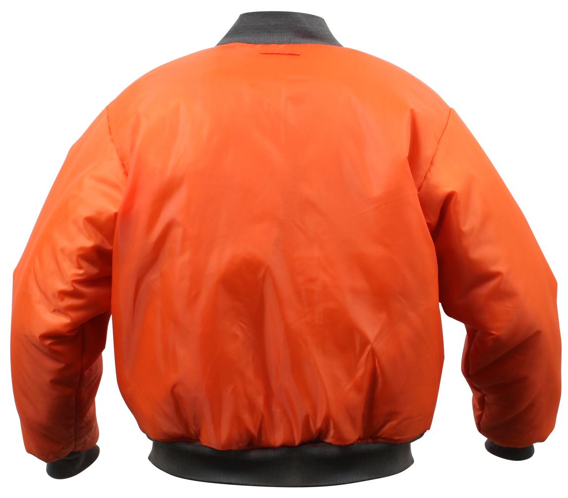 Rothco's MA-1 Flight Jacket features a fully reversible rescue orange polyester lining, and a 100% nylon water repellent outer shell to give a classic bomber jacket look. A poly fiberfill lining and zippered front closure and storm flap help keep you warm. The MA-1 Jacket has an extra full cut and ribbed knit collar, cuffs, and waistband for a perfect, comfortable fit. A zippered utility pocket and outside pencil pocket on the left sleeve, two front slash pockets, and two interior slash pockets offer many storage options for essential gear. Brass zippers and leather pull tabs add to this classic military style jacket.